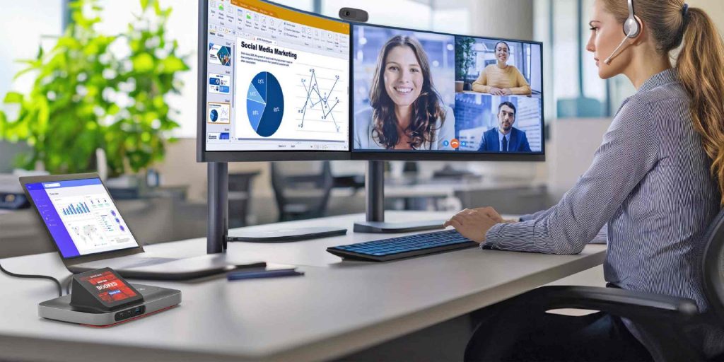 Además de su función como terminal de gestión, el dispositivo ofrece una conectividad avanzada que permite alimentar portátiles con hasta 100 W y conectar periféricos mediante varios puertos USB-C y USB-A, integrando también Bluetooth 5.0, Ethernet de 1 Gbit/s, WiFi 5 y compatibilidad con hasta dos monitores 4K a través de HDMI 2.0 y DisplayPort 1.4. El cableado queda protegido en la parte trasera gracias a una cubierta que evita tirones y contribuye a la durabilidad del equipo en entornos con rotación constante de usuarios, mientras que en el frontal se incluyen dos puertos USB-C y un USB-A de acceso rápido.