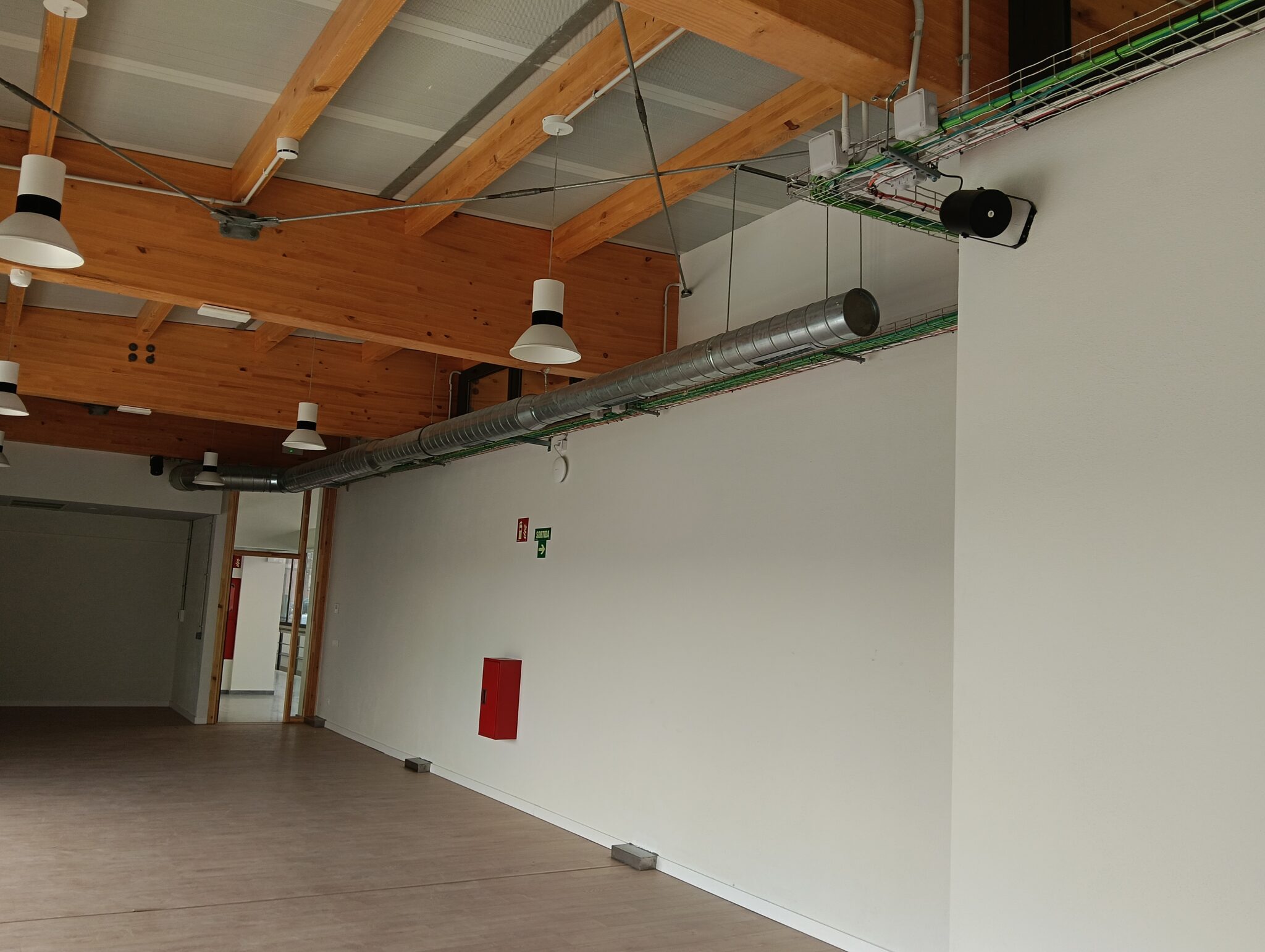 En zonas interiores —vestuarios, pasillos y salas auxiliares— se han instalado proyectores de sonido de alta directividad junto con altavoces de techo, logrando una distribución uniforme del audio sin impacto visual sobre la arquitectura del edificio.