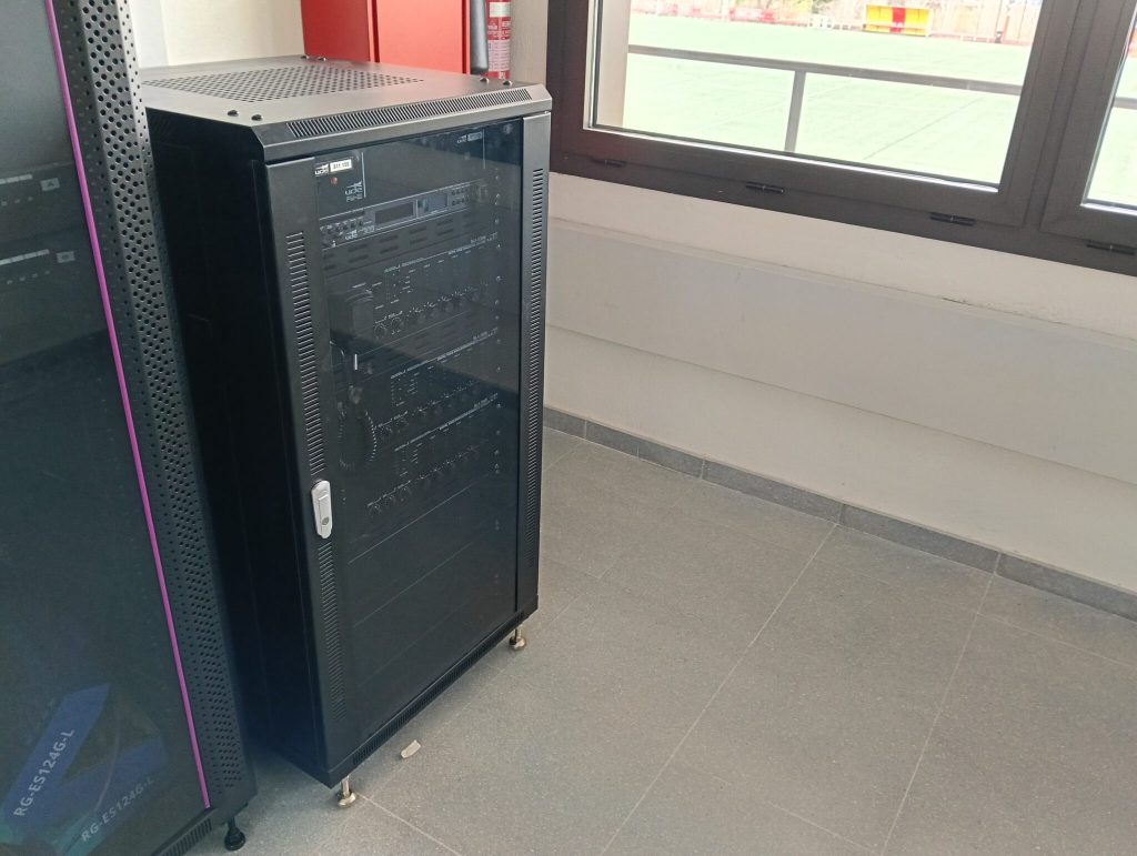 El sistema se integra en un rack de control central desde el que se supervisan todas las funciones: emisión de avisos en directo, reproducción musical y gestión de prioridades. Esta configuración permite una rápida respuesta ante incidencias y facilita la operativa del personal técnico del recinto.