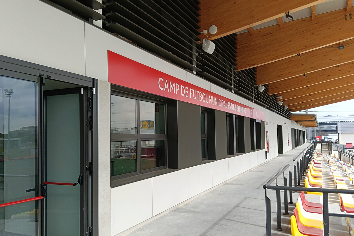 El Campo Municipal 25 de Setembre, con capacidad para más de mil espectadores, combina zonas de graderío con espacios interiores como vestuarios, pasillos y áreas de servicio. Para dar cobertura a este entorno heterogéneo, Plana Fàbrega ha diseñado una solución de megafonía de línea de 100 V específicamente orientada a aplicaciones de evacuación por voz.